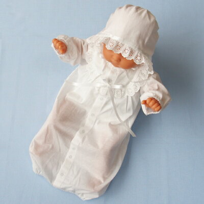 胸元のサテンリボンやレースもポイントですよ! 総丈は、実寸で50センチ (うしろ襟から足元裾までの実寸です) タグの表示サイズは身長50から70 体重3キロから9キロ *着用期間は、新生児から生後6ヶ月程度を目安にお考え下さい。