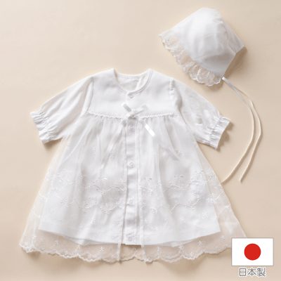 創業 昭和34年 老舗ベビーメーカーだからこそ赤ちゃんの快適さ・可愛さ&ママとパパの扱いやすさどちらも両立させました胸元はニット生地の上に重ねられたオーガンジーの透け感が上品にセレモニーシーンを演出します●生地から仕上げまで安心・安全の日本製です●ベビー衣料専門メーカーとして創業 昭和34年以来、赤ちゃんが着る物だから安心・安全・高品質を保つため自社一貫生産にこだわり生地の裁断から仕上げまで大阪の自社工場で1枚・1枚丁寧に縫い上げています。